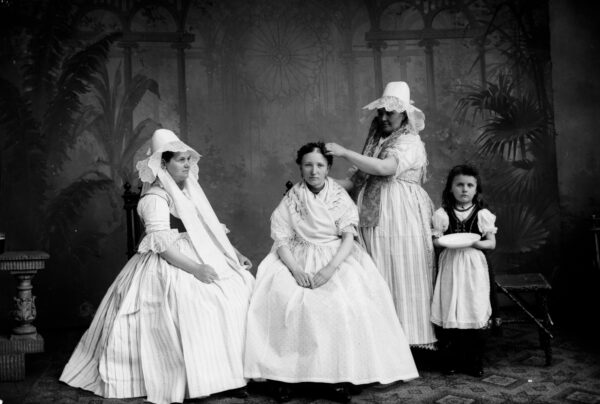 Dziewczęta chodziły z gładko zaczesanym warkoczem. Na duże uroczystości miały zielone mirtowe wianki założone na klapy, czyli pięć warstw szerokich, ułożonych w głębokie fałdy wstążek, które przysłaniały uszy, a ich długie końce opadały na plecy. Klapy przyszyte były do związki – szerokiej wzorzystej wstęgi opasującej głowę. Spod związki wystawał urbinek, czyli pasek granatowego sukna wycięty w ząbki. Starsze dziewczęta pod wieńcem miały kilka szerokich wzorzystych wstążek związanych w dużą kokardę i spiętych małym lusterkiem, zwanym zdżadłem.
