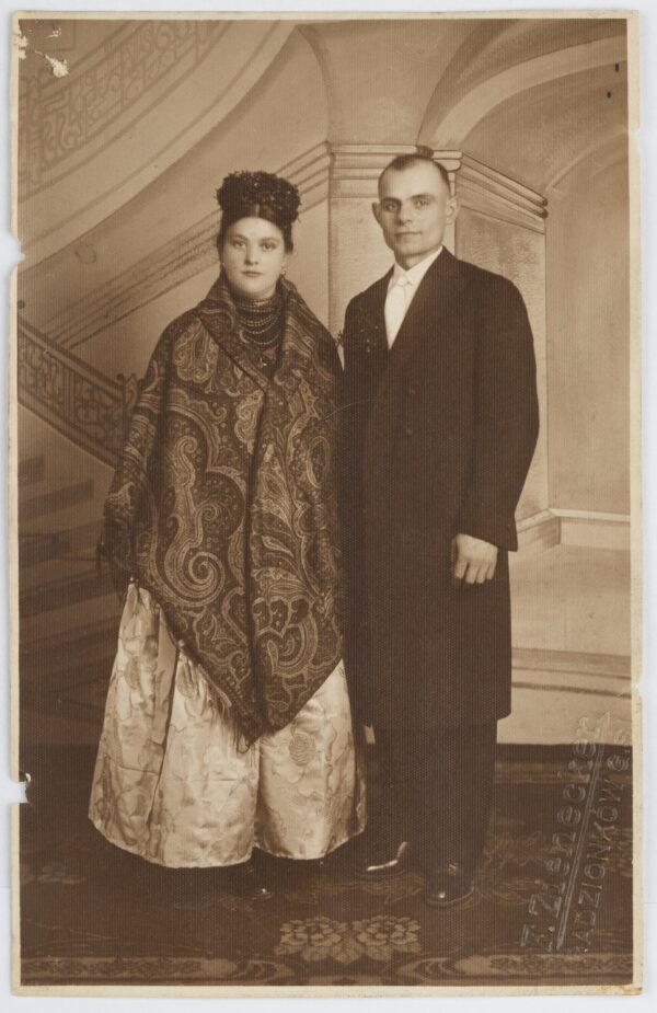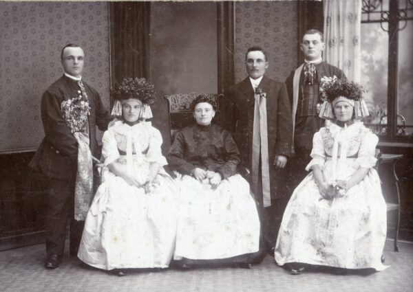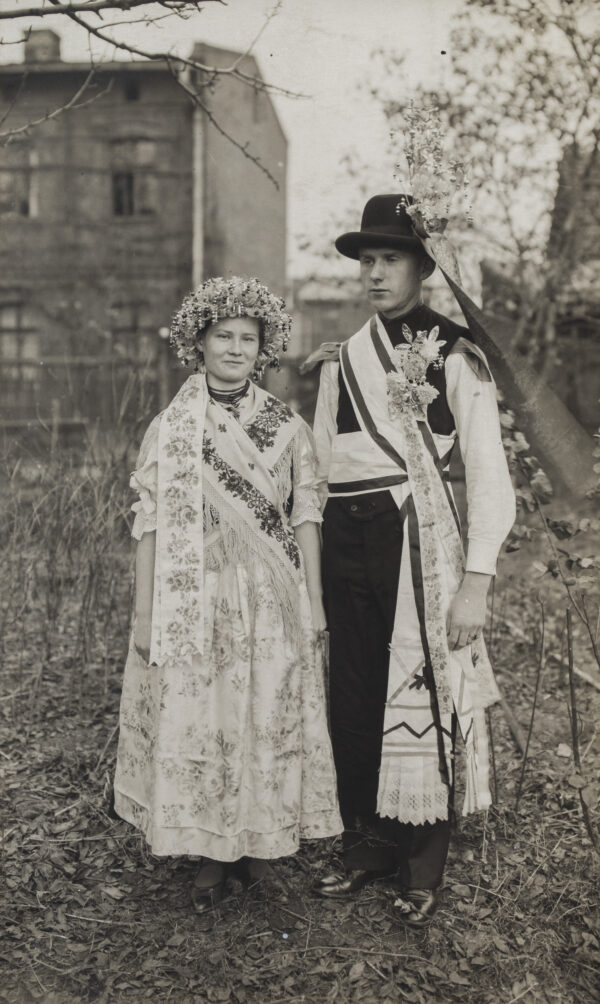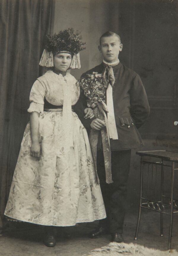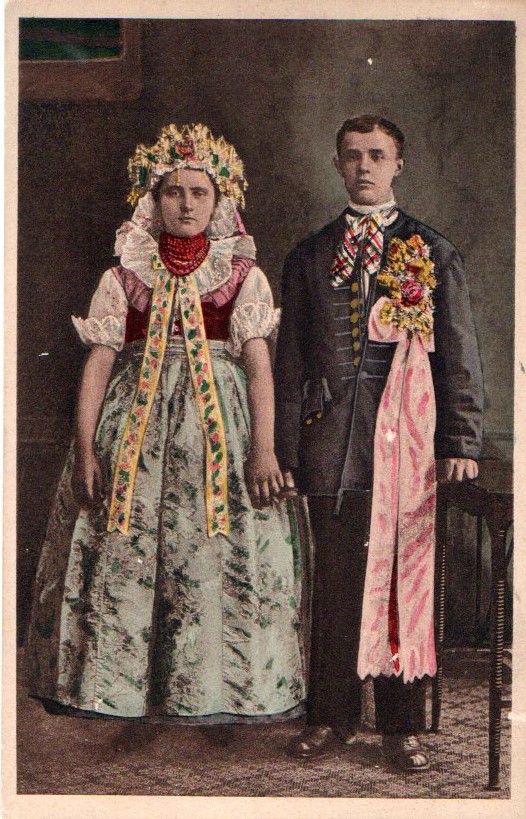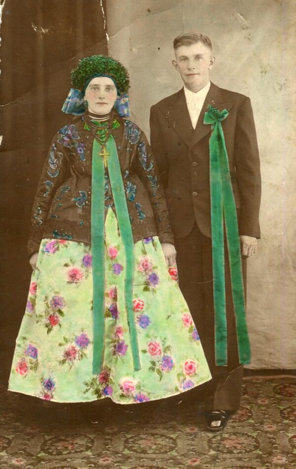 Strój pana młodego wyróżniała długa zielona wstążka, u góry związana w kokardę, przytrzymująca bukiecik mirtu lub bukszpanu. Przypinano ją po lewej stronie bruclika lub sukmany. Drużba miał ponadto przypiętą dużą różdżkę w formie bukietu ze świecidełek i sztucznych kwiatów, głównie w różowym kolorze, przewiązaną szeroką brokatową kokardą. Podobną różdżkę nosił przy kapeluszu starosta weselny. Do I wojny światowej przepasany był także przez ramię białym płóciennym ręcznikiem zakończonym frędzlami.