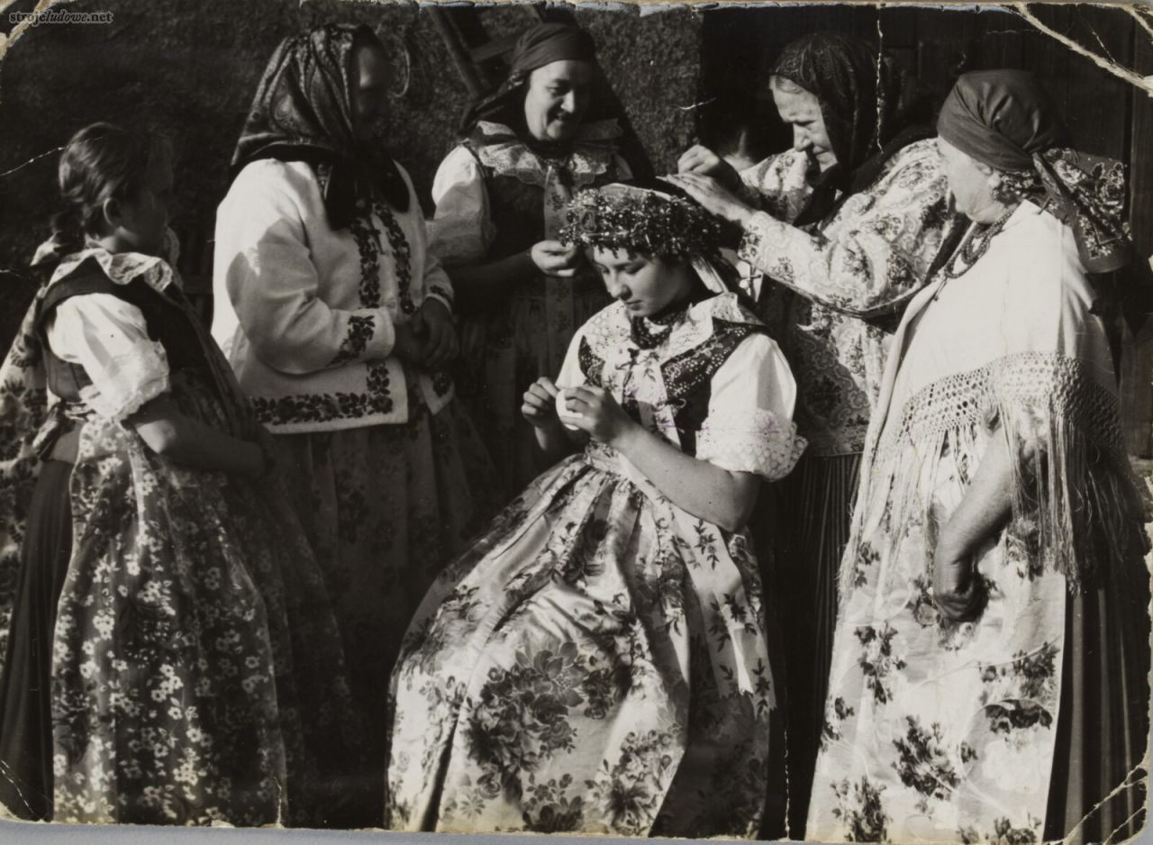 Dziewczęta w odświętnych strojach rozbarskich, Rozbark (obecnie dz. Bytomia), 1944 r. Ze zbiorów Muzeum Górnośląskiego w Bytomiu.