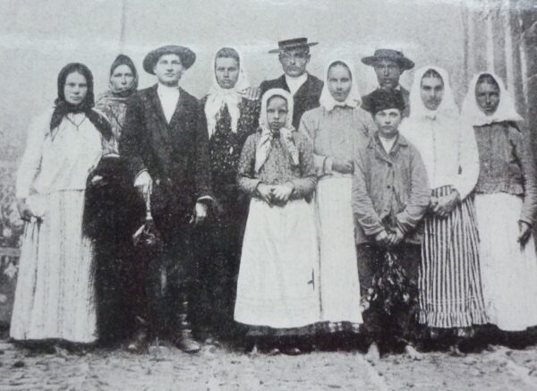 Elementy odzieży męskiej szyto głównie z lnianych i wełnianych tkanin samodziałowych. Letnim nakryciem głowy mężczyzn zarówno codziennym jak i świątecznym był kapelusz słomiany, zimowym zaś rogatywki i czapki z futra baraniego. Przywdziewane koszule miały początkowo krój przyramkowy, a po I wojnie światowej często krój z karczkiem. Wszystkie były szyte z lnianych samodziałów. Koszule noszono wpuszczane w spodnie a na nie zakładano kamizelki i kaftany – latem z barwionych samodziałów lnianych, zimą z folowanego sukna. Letnim okryciem wierzchnim mężczyzn była parcianka czyli rodzaj szytego z płótna płaszcza, a zimowym kożuch oraz używana w zasadzie przez cały rok, głównie do stroju świątecznego, sukmana. Uzupełnienie ubioru stanowiło obuwie, którego najstarszym typem były łapcie z łyka lipowego. W ostatniej fazie noszenia stroju ich miejsce, głównie od święta, zajęły buty z cholewami.