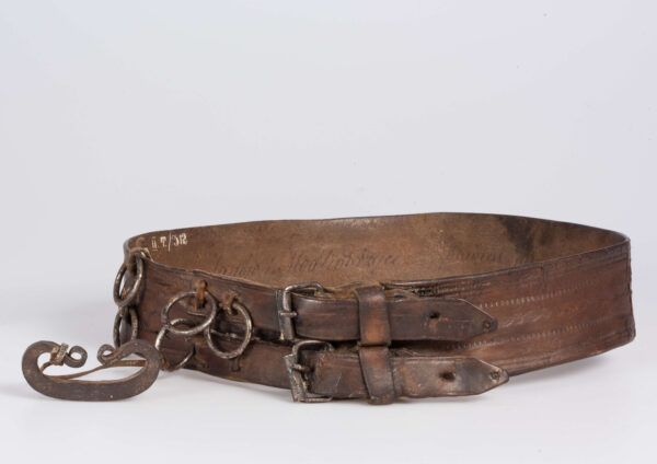 Dodatkiem do stroju męskiego był zapinany na dwie sprzączki pas rzemionkowy, który mógł być ozdobnie wytłaczany w geometryczne wzory wykonane stempelkami. Starsi mężczyźni nosili także laski domowego wyrobu. Na szyi zawieszano szkaplerze, krzyżyki i medaliki.
