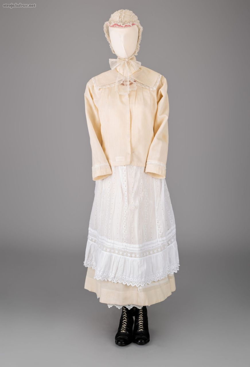 Koszula kobieca, o kroju przyramkowym, bawełniana, haftowana haftem krzyżykowym z ozdobnymi zaszewkami przy rozcięciu, ze zbiorów Muzeum Narodowego w Lublinie.