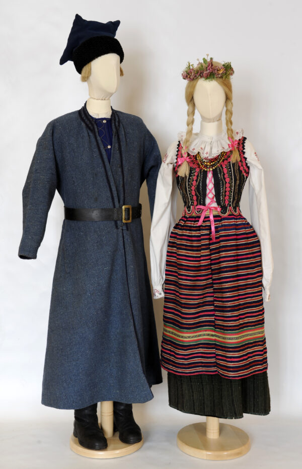 Męski strój odświętny był niemal w całości szyty z samodziałów lnianych i wełnianych. W użyciu było kilka rodzajów nakryć głowy. Latem noszono kapelusze słomiane, a przez resztę roku różne czapki, takie jak: gamerki, maciejówki, rogatywki, rozłupy i tzw. śpiczaste. Ponadto na ubiór składały się: koszule, spodnie, kamizelki oraz kilka odmian i wariantów sukman oraz obuwie. Strój męski przestał być powszechnie noszony pod koniec XIX w. Jego miejsce zajął bardziej elegancki i nowoczesny w opinii miejscowych ubiór wzorowany na modzie miejskiej. Zdarzało się, że w poszczególnych wsiach jeszcze w pierwszych dekadach XX w. mężczyźni, szczególnie na co dzień, donaszali poszczególne elementy stroju tradycyjnego. Zwykle były to sukmany, kamizelki i buty z cholewami. Te ostatnie używane były także do stroju odświętnego.