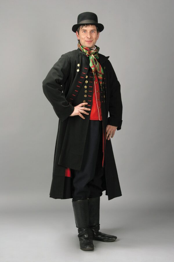 Strój mężczyzny żonatego nieznacznie różnił się od tego kawalerskiego. W oczy rzucają się przede wszystkim czarne spodnie zamiast białych (które wkładano w buty kropowe o mniejszej ilości harmonik) oraz katana, która zastępowała kawalerski kaftan. Różniła się od niego długością, bo sięgała aż do kostek, oraz posiadaniem rękawów. Również miała dwadzieścia cztery mosiężne guziki i tak jak kaftan, zawsze nosiło się ją rozpiętą. Początkowo katana była koloru granatowego, ale już od połowy wieku XIX – czarnego. Dodatkowym elementem ubioru mężczyzny był efektowny czarny podszyjnik (inne nazwy: fartuszek, bindka) uszyty z sukna lub rypsu w haftowane kolorowymi nićmi wzory roślinne. Pod szyją wiązali też żonaci wełnianki, czyli wełniane lub bawełniane pasy w ciemnoczerwonym kolorze, wyrobu fabrycznego, które zastępowano jedwabnicami podczas uroczystości obrzędowych.